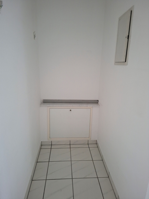 Die Bodenbeläge bestehen im gesamten Bereich aus weißen Bodenfliesen, die pflegeleicht sind und dem Raum eine zeitlose, klare Optik verleihen.